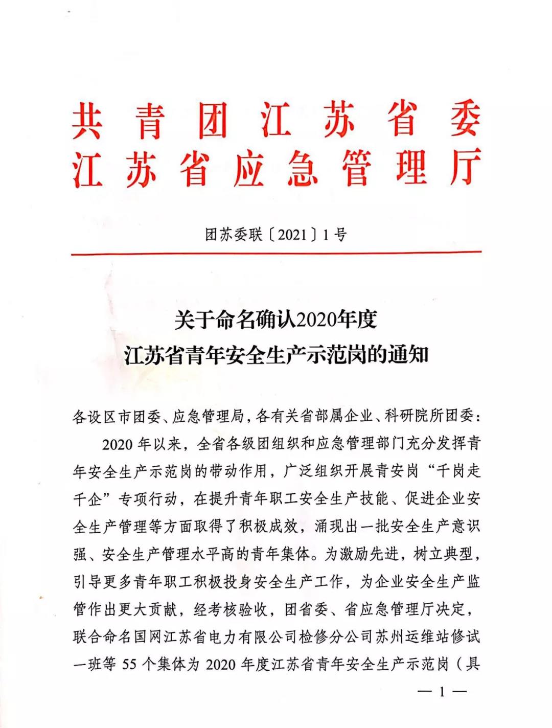 近日,共青團江蘇省委、江蘇省應急管理廳公布瞭(le)獲得“2020年度江蘇省青年安全生産(chǎn)示範崗”榮譽稱号的集體名單,江蘇恒神股份有限公司工務事業部動力科獲評“2020年度江蘇省青年安全生産(chǎn)示範崗”。