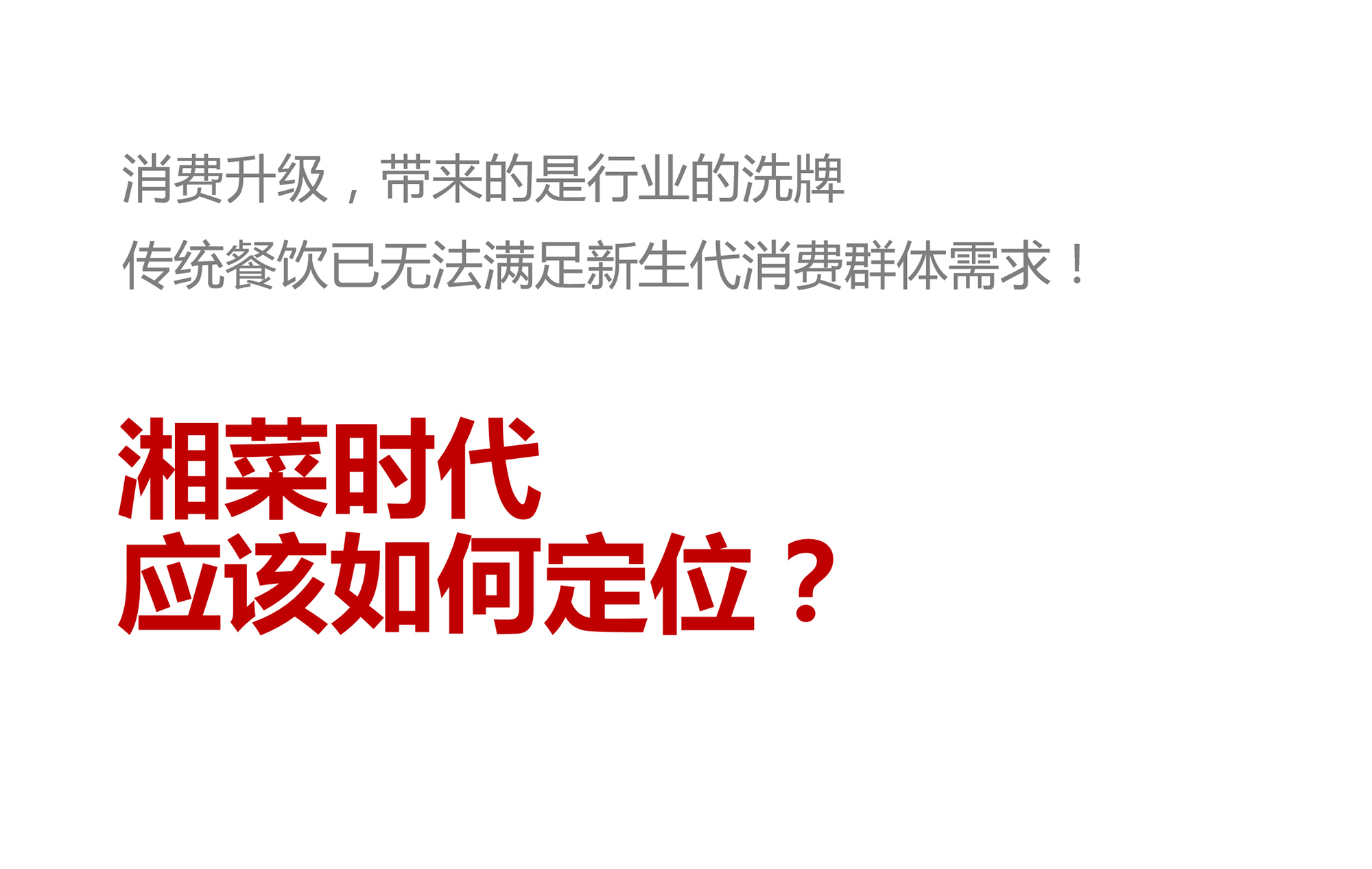首先我們爲湘菜時代進行精準的定位,在正統湘菜、時尚湘菜、精緻湘菜、新派湘菜中,我們通過數據的調研,人群的分析,確(què)定爲其定位爲從辣到鮮,具備(bèi)精緻和文化底蘊的符合60後、70後、80後、90後消費人群的新派湘菜。